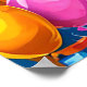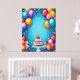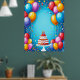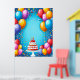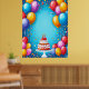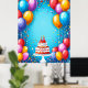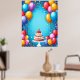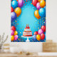 Färgglada ballonger och konfetti omger en lagerfödelsedagstårta med ljus mot en livfull blå bakgrund och skapar en livlig feststämning. Perfekt för födelsedag, fest och festliga designkoncept.