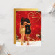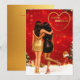 Två vänner i glamorösa klänningar, en i guld och den andra i svart, delar en varm kram mitt i en festlig julmiljö. Scenen är prydd med gnistrande ljus, ett vackert dekorerat julgran och ett hjärtligt födelsedagsmeddelande till en bästa vän.