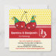 En originell och enkel tecknad illustration av två stiliserade tecknade söta och glada tvillingröda körsbär som bär födelsedagsfesthattar.