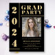 Fetma och fängslande typografi styr strålkastarljuset, med en framträdande plats i ord "2024" och "Grad Party" i ett teckensnitt för contemporary. Användan svart som det primära färg för bakgrunden ökar läsbarheten och ger en känsla av formalitet.