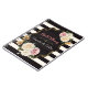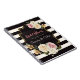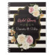 Behålla av möhippa- eller möhippa-presentationer med den här chicen och den moderna bärbara datorn spiral som matchar samlingen inbjudningskort för möhippan som visas nedan och som har en svart och elfenbensstrimmig bakgrund i mönster med en dekorativ svart övertäckning som trimmas i guld med blommor på den övre högerna och nedre lämnat hörn. I buketterna med blommigt ingår flera ro i gult av rosa, kräm och blek med orange Peruanska liljor och grönt foliage blandad i. Anpassadet ord, "Möhippa Guests & Gifts" är tryckt i elfenben och korall rosa, och det finns en dekoration för blommigt mellan linjer av text. Den här handdatorn bröllop eller duschdatorn kan användas för alla typer av anteckningar du behöver till behålla om duschen, bröllop, repetitionsmiddagen eller planerna.