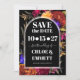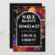En svart Boho-båge med ett genomskinligt kant-ramar som du sparar datuminformationen. Den fetstilta vita texten ge i det här fallet Spara datum för trendigets visning. Blommigtarna är rena fall. Riken är burgudröd, ljusstark orange med träffar på lila och rosa. Baksidan är också svart med en fallbukett. Det här objektet är en del av Blommigten Modern Autumn. Meddelande mig om du behöver hjälp med att hitta matchande objekt. Min namn är Nelda och jag vill hjälpa kärlek.