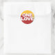 Detta dekal har ord "ONE KÄRLEK" i fetstil, vitt brev på en övervägande gult och röd bakgrund med en liten mängd grönt. En Kärlek. Det är allt vi behöver.
