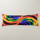 Denna vackra kudde har en abstrakt med tre dimensioner mönster av regnbågskarp måne i fet färg med rött, orange, gult, grönt, blått och lila mot svart bakgrund.