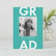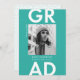 Snyggt och moderna inbjudningar till studentfest av foto med "Grad" i fetstil, vitt brev, turkobakgrunden och trendigets geometriska mönster på baksidan. Anpassa inbjudningarna till studentfesten genom att lägga till uppgifter om student, namn, skola, studenten och party.