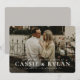 nyheterna om din förlovning och det kommande giftermål med det här enfoto-vågrät spara datumkortet med en vit elegant som sitter vid grund i ett vågrät-foto. Baksidan är en neutralt skugga med en subtil struktur mönster. Du kan justera färg genom att klicka på "Anpassa".