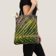 Den här Tote Bag-filen innehåller originalbilder av abstrakten från ZoeSPEAK, som är gjorda av ett originalfoto av en reclinata handflatan-frond. Den starka Florida sol betonar löven, som växer ut från ryggraden som rand på diagonalrader. Gräsmatta, i mjukt fokus, utgör gröntens bakgrund.