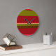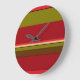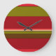Den här enkla men dekorativa väggklockan har en färgstark abstrakt mönster av fetstilt geometriskt rand i färg med rött, orange, brunt, oliv grönt, svart och tan.