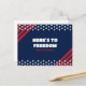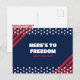 Fira Independence day med det här slående helgdag-vykortet som har en djärv design av rött, vitt och blått stars och stripes. Budskapet "HERE'S TO FREEDOM" och "LYCKLIG 4:E JULY!" står mot en marin bakgrund och skapar perfekten för att du skickar ditt patriotiska hälsning. Baksidan av vykortet innehåller utrymme för anpassningsbara texter, så att du kan lägga till ditt eget speciella meddelande till vänner och familj.