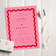 En modern och stilren bröllopsinbjudan med en retro-känsla med en vågig scallop-ram i rött med en rosa bakgrund och röd text.