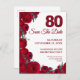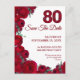 Meddela en speciell milstolpe med den här feta röda blommigten Spara datumkortet för en 80-årsdag. Med djup röd ranunculus-blomning på vit bakgrund och blommigt-fylld "80"-typografi är designen helt anpassade för din händelseinformation. Matchningsbudskapet firar 80 år av kärlek, skratt och minnen. Perfekt för ett modernt och elegant firande. Njut!