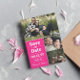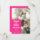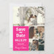 Fotokollage sparar datumet i en återtypografisk design och fet rosa accent färg. Spara datum-personligen med tre foton, bröllop-datumet med fet stil, vita siffror och namn i ett modernt skript.