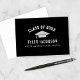 Visa din skolfägring med detta snygga tackkort för examen med en falsk silverfärgad examenskeps på en fet svart bakgrund. Ett välvt universitetsår markerar designen med ditt namn och skola i ren vit och silver typ nedan. Insidan visar din favoritporträttbild med utrymme för ett personligt meddelande. Anpassa allt för att matcha din stil.