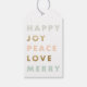 En modern typografisk julklappstagg med fet, ljus text i en mängd olika alternerande färger och guldfolie.