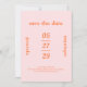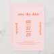 Modern bröllop spara datum-kort med ett fet och typografiskt stil med "spara datumet" överst, en namn på vardera sidan och ditt datum i mitten. Din händelseinformation visas nedan. Temat färg regnbåge (rosa och orange) och kan ändras i verktyg för designredigering. Den här avslappnaden tropiska stil sparar datumkortet underbart för ett informellt vår eller sommar-bröllop.