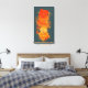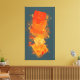 En konstnärlig målning och abstrakt i ljusa , orangar och gulter som färg används för att rita slumpmässiga layouten för grena fyrkanter, linjer och organiska former..
