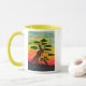 En vacker korallsolnedgång belyser de badplatser som växer på backe. Träd ritas vackert på kvällen himlar. Det grafiska presenterna självt på mugg.
