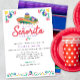 Sätt tonen för en festlig firande med denna Fiesta Baby Shower-inbjudan, med en färgrik blomsterhatt, papel picado-banner och starka fiesta-färger. Denna livfulla design är perfekt för en "Taco 'Bout a Baby"-tema shower, oavsett om du är värd inomhus eller planerar en bakgårds-fest. Anpassa med dina festdetaljer för att göra den unik.