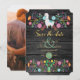 Vackra moderna och roliga bröllopsfiesta Save The Date-kort med en mallruta på baksidan där du kan lägga till ett foto av paret, vilket gör det till en unik souvenir för dina gäster eftersom det kan ramas in. Framsidan har vackra akvarell folkkonstblommor, en söt lama, alpacka, kaktusar, handskrivna teckensnitt och trendiga et-tecken. För matchande artiklar, anpassade redigeringar kontakta Designer LeahG.