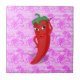 En röd och het peppar-figur i tecknad stil. Originaldesign med rosa spetsmönster i bakgrunden.
