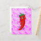 En röd och hett peppar tecknade figurer. Ursprunglig utformning med rosa snöre mönster i bakgrunden. Anpassningsbar vykort. För alla fester ni kan föreställa er! Tanken på kryddig mat älskare.