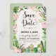 Rustik fiesta save the date inbjudan med akvarell suckulenter, rosa rosor och modernt kalligrafiskt typsnitt.