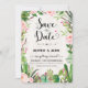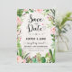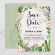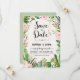Rustik fiesta spara datum inbjudan med akvarell suckulenter, rosa rosor och modernt kalligrafiskt bokstavsstil.