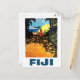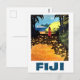 Fiji, kvinna på tropiken kusten och turistbåt vykort