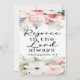 Ett vackert kort för blommigt med "Rejoice in the Lord Always" Philippians 4:4 "Låt detta bli en milt påminnelse: Oavsett årstid är Herren nära.." Till och med i rättegångarna finns glädjen i hans närvaro. Låt ditt hjärta lyftas, din själ fräschas upp och din själ förankrades i glädjen att bara han ge. Ta ett djupt andetag. Smilt. Gud är fortfarande bra. Och det är alltid en anledning att glädjas." är citatet på baksidan av detta platta kort.