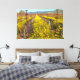 Bilden visar en vinodling i blomning i fullt, med ljusa senapsblommor i gulten som täcker marken mellan grapevinraderna. Vinerna själva är rena och brunt grenar stöds av stolpar och ledningar från metall. I bakgrunden skapar rullning av backe och ett tydligt blå himmel en sund atmosfär. Utsikterna ligger långt ned på raderna, vilket understryker vinodlingens djup och .