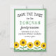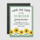 Magnetiskt spara datumkortet för en familjeåterförening med ljusa solblommor av gult och en gräns av grönten runt inbjudningstexten, som skrivs i två charmerande typsnitt i svart och grönt.
