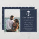 Det här Nautical Monogram Photo Spara datum meddelande levereras med en enkel textdesign, ett enkelt nautiskt ankare för brid- och groommonogram i en modern skisserad låda som väntar på att ditt foto och dina bröllop-detaljer ska anpassas. Ytterligare färg tillgänglig med den här designen. Perfekt för par som har en kustnära bröllop.
