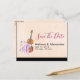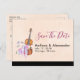 Ett vykort i bröllop spara datum med feminin utformning. Illustrerad med en vattenfärgsbild av en violin av trä, en del rosa ballet tofflor som vilar mot den och dekoreras med blommor och fjärilar. Ställ in på en persiko-rosas färgad-bakgrund.