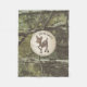 En ullfilt som presenterar en illustration av en hjort. Bakgrund är kamouflage. Personifiera namn.