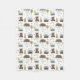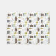 En ullfilt som presenterar ett mönster med illustrationer av en björn, berg, champinjoner och pilar. Personifiera namn.