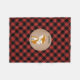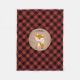 En ullfilt som presenterar en illustration av en räv. Bakgrund är den svart och röda buffelplädet. Personifiera namn.