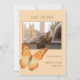 Enkelt. Modern. Elegant. Snygg Orange Monarch bröllop spara datum-inbjudan med foto. Den här bröllopsinbjudan innehåller en vattenfärgad illustration av en serenfjäril som flyger mot en sol som brinner med sol-strålar. Det finns vackra skuggor av muterad orange, brun och grädde. Redigera det här kortet med ett bild av det förlovade paret.