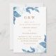 Den enkla och elegant blåa och vita bröllopsinbjudan har guld färg typografi och vackra blåa blommor och löv på framsidan med en blå baksida. Visa den här insamlingen i chic bröllop för samordning av sändningstillbehör.