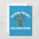 Fysikalisk behandlingshus inifrån. Ett snyggt sjukgymnastiskt citat vykort med ett vackert träd med regnbåge löv och hjälp händer som träd armar och ben som hiss upp dem. Motiv och vacker present till en PT.