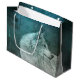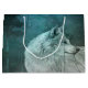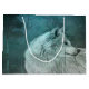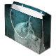 En handväska med ett foto av en strålande hårig fluffy grått-varg. I bakgrunden finns en mörk skog med träd. Magisk mystisk vibe.