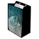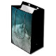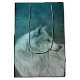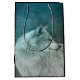En handväska med ett foto av en strålande hårig fluffy grått-varg. I bakgrunden finns en mörk skog med träd. Magisk mystisk vibe.