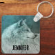 Personligens nyckelkedja med ett foto av en fantastisk hårig fluffy grått-varg. I bakgrunden finns en mörk skog med träd. Magisk mystisk vibe.