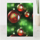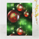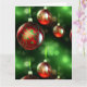 Konstnärlig gul och grön rullning dekorerar festligt de röda julgranskulorna i denna detaljerade närbild. Dessa fina glaskulor dinglar på grönt band framför en abstrakt bakgrund av grönska och julbelysning. Ett snyggt sätt att önska God Jul! ANPASSA med din egen julhälsning på insidan av kortet.