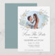 Vår ömma botaniska samling har ljust grönt, turkos och guld ömt vattenfärgblad i kombination med förgyllda ramar och turkos bakgrund för en perfekt elegant brölloppssamling. Du kan hitta matchande föremål för din fullständiga bröllopsupplevelse men också hantverk, presenter och några personliga föremål. Vi tror att du kommer att njuta av det maximalt eftersom det är en samling för varje säsong. Detta kort för att spara datum har ditt eget foto i en blå bladkrans med all information i elegant skrivstil för dig att anpassa.