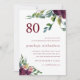 Vacker och chic vattenfärgad botanisk blommigt och gienery åtttioårsfirandefest, har en underbar pastellös rosa tillbaka med lila burgundblommor och grönska, och en vit front med elegant 80 typografi och blomning med lövlök.