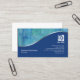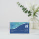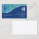 Ett tvåsidigt affärskort med det översta avsnittet med vattenfärg tvättar i blått, turkos och grönt. Den blå sektionen nedan är åtskild från överkanten av en glansig kromvågremsa. I det här nedre blåa avsnittet visas namn, titel, logotyp och kontaktuppgifter för företag. Perfekt för arkitektur, administration, konst, konstnärlig konst, formgivning, designer, kreativ teman. Anpassa den omedelbart med din egen namn och detaljer.