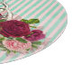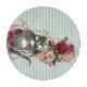 Roligt och runda styckningsskivor i finare har en rosa- och akvaserad bakgrund, rosa och burgundfärgad blommigt bouquet och vintage Alice i underlandet Cheshire Cat illustration.