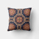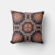 En kudde med en upprepande mönster av dekorativt inslag i blommor, stjärnor och sol.