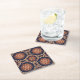 En papper underlägg (ett torrt pappersmasskort) med ett upprepat mönster av dekorativt inslag i form av blommor, stjärnor och sol.