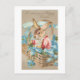 Påskhare av den akuta vintagen, klädd i finare, skjorta och rosa jacka sitta i ett rustiskt basket fylld med blå glöd-minnen och bunden med en blått band. Front hälsning är "Att önska dig en Glad påsk" i guld skript. Baksidan innehåller redigerbar fält och kompletterande skal- och blomgrafik.